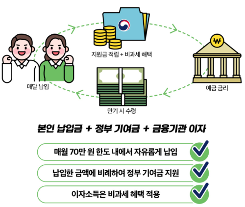 연 소득이 6천만 원 이하인 청년은 최대 6%의 정부 지원금과 함께 비과세 혜택을 받을 수 있습니다. 6천만 원~7천5백만 원 이하인 경우는 정부 지원금 없이 비과세 혜택만 주어집니다. 금융상품 이자 수익에는 보통 15.4%의 세금이 부과되는데 비과세 혜택으로 세금을 내지 않아도 되는 만큼 만기 때 받을 수 있는 돈이 더 많아집니다.