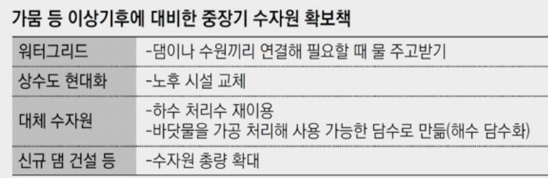 바닷물이나 한 번 쓰고 버리던 물을 재처리해 다시 쓰는 ‘대체수자원’도 대안으로 떠오르고 있습니다. 물 재이용은 하수를 재처리해 비교적 낮은 수질기준이 요구되는 공업용수·조경용수·친수용수 등에 활용할 수 있습니다. 지하수 저류지는 댐과 같은 역할을 하는 것으로 땅속 지하수를 저장할 수 있는 공간을 확보하는 방안입니다.